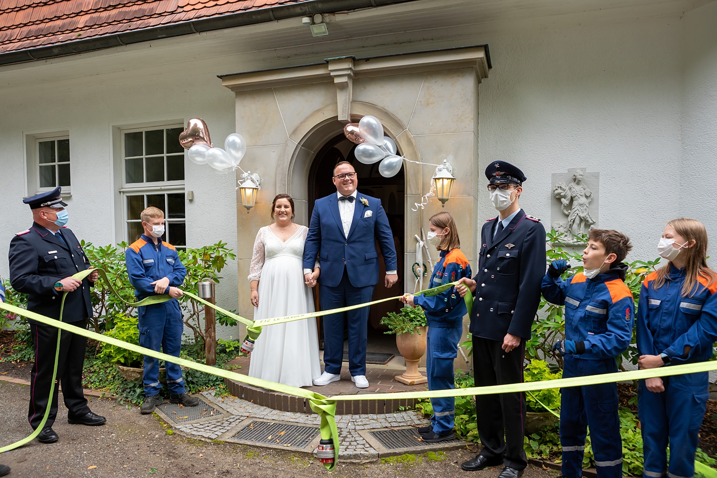 Es war eine fröhliche Trauung, bei der viel gescherzt und gelacht wurde. Nach den Gratulationen der Hochzeitsgäste erwartete die beiden aktiven Feuerwehrmitglieder, ein Spalier der Mannschaftskollegen.