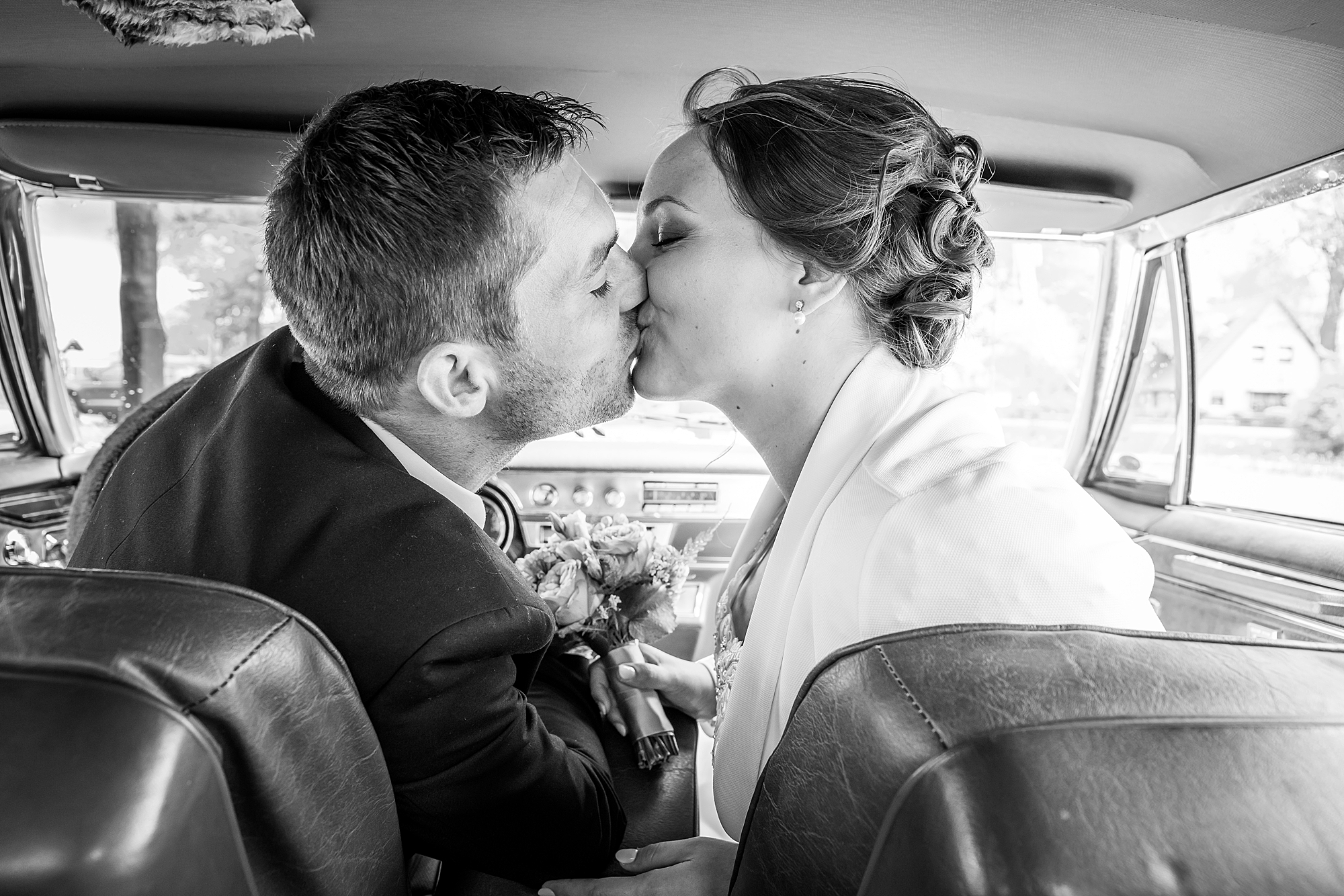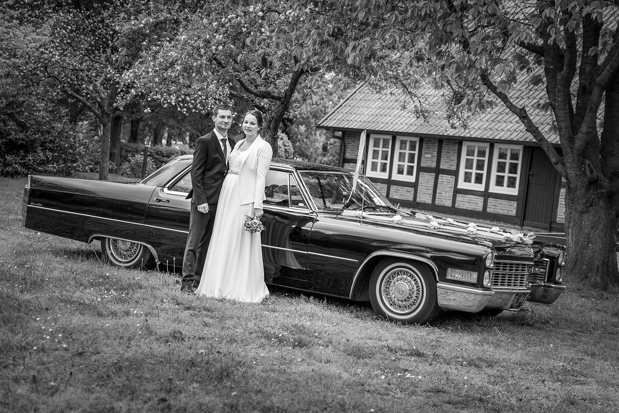 Aber damit war es noch nicht genug, die nächste tolle Überraschung wartete auf die Braut, als sie aus dem Haus kam. Standesgemäß wurde sie von einem Klassiker ganz in schwarz erwartet. Einem Cadillac!