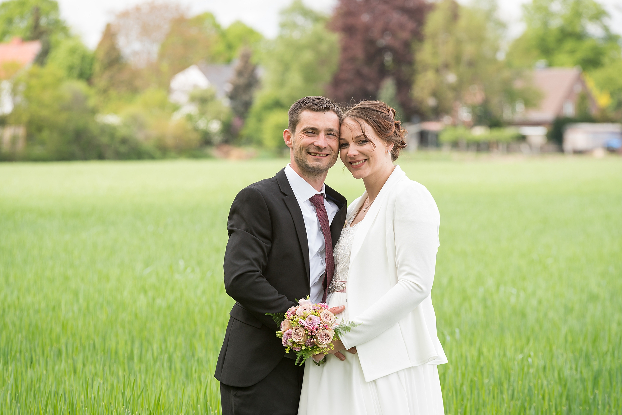 Nach dem „Ja-Wort“ machten wir Familien- und romantische Brautpaarportraits auf dem toll angelegten Gelände, rund um das Heimathaus. Sowie in einem benachbarten Feld, bevor ich das Brautpaar zur fröhlichen Gartenparty nach Hause entließ.