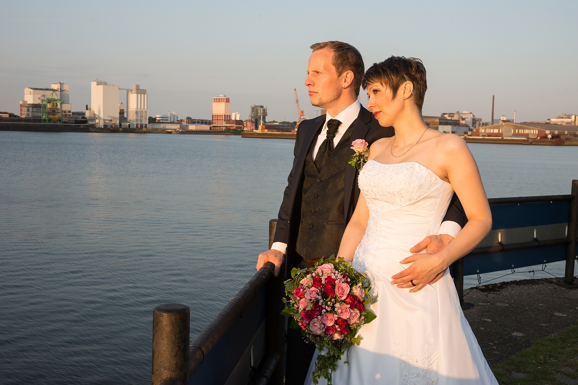 Sabrina und Christoph hatten ganz genaue Vorstellungen von ihren Hochzeitsbildern und so überlegten wir gemeinsam, an welcher Location wir diese am besten umsetzen könnten. Unsere Wahl fiel auf den Molenturm und auf die Hochschule für Künste. Beides befindet sich in der Überseestadt Bremen. Um den eigentlichen Hochzeitstag ein wenig zu entstressen und um die beste Tageszeit für so ein Shooting nutzen zu können, machten wir das Brautpaarshooting einen Abend vor dem offiziellen Hochzeitstag. Es war einfach wunderbar, ganz entspannt und ausgelassen das Shooting bei allerschönsten Wetter bis in den Sonnenuntergang hinein machen zu können.
