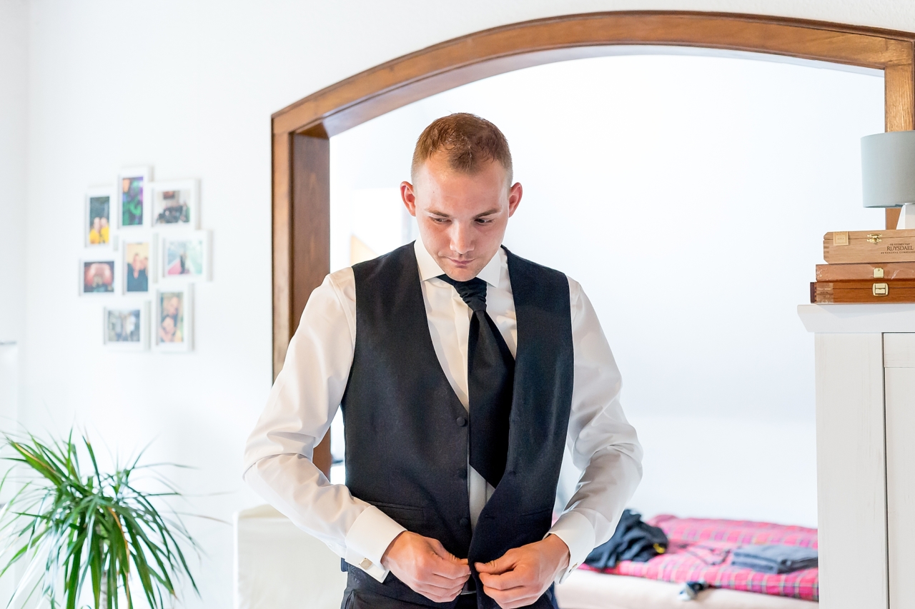 Der Tag begann für mich mit dem Aufbau meiner Fotobox im Waldschlösschen Daverden, bevor ich zum Getting Ready zu Daniel nach Verden fuhr. Dort angekommen, traf ich auf einen sehr aufgeregten Bräutigam und seine Trauzeugen. Alle machten sich gemeinsam in der Wohnung von Daniels Bruder fertig und so war ich ruckzuck von schick gekleideten, jungen Männern umgeben.